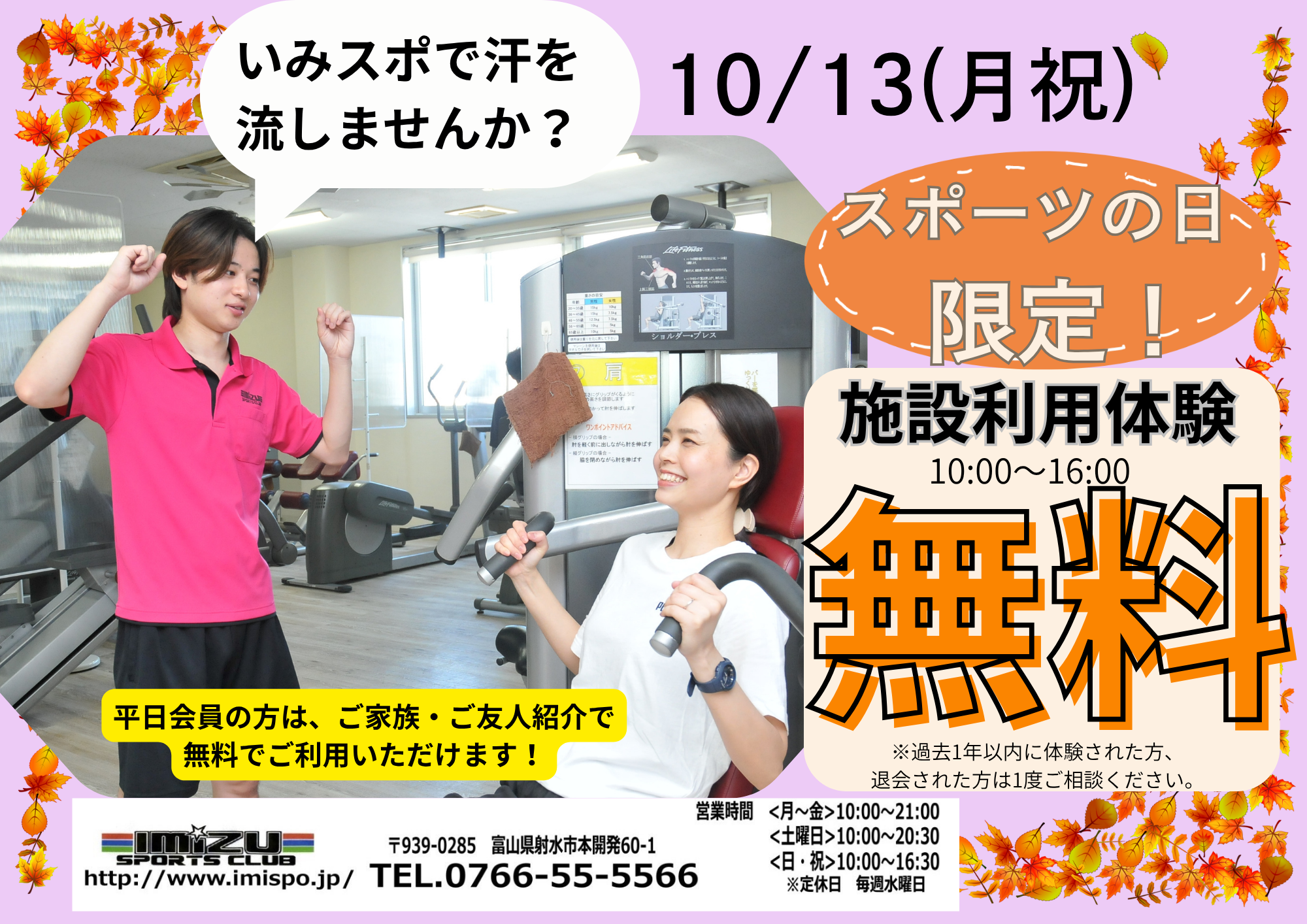 10月13(月祝) スポーツの日に無料体験会を実施します! 運動の秋に気持ち良く汗を流しませんか?