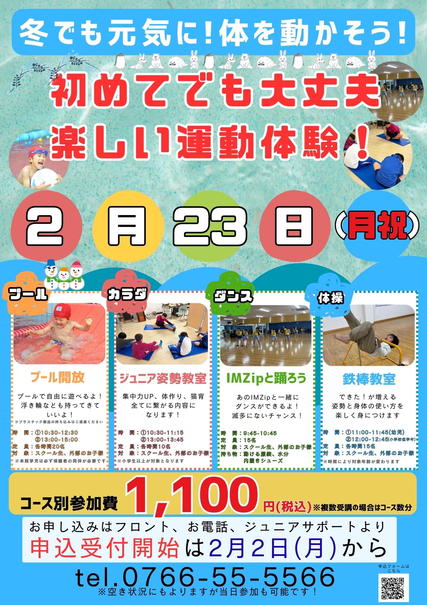プール、姿勢教室、ダンス、鉄棒教室を体験できます!